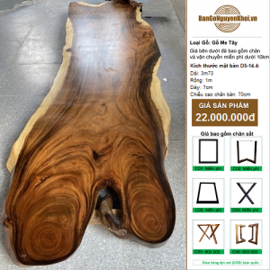 Giá chân sắt 7 nan: 2.000.000đ Giá mặt bàn gỗ me tây 1m2 rộng 60/70cm dày 5cm giá: 2.500.000đ Giá mặt bàn gỗ me tây 1m4 rộng 60/70cm dày 5cm giá: 2.900.000đ Giá mặt bàn gỗ me tây 1m5 rộng 60/70cm dày 5cm giá: 3.100.000đ Giá mặt bàn gỗ me tây 1m6 rộng 60/70cm dày 5cm giá: 3.300.000đ Giá mặt bàn gỗ me tây 1m8 rộng 70/80 dày 5cm giá: 4.000.000đ Giá mặt bàn gỗ me tây 2m rộng 80/90cm dày 5cm giá: 5.600.000đ Giá mặt bàn gỗ me tây 2m2 rộng 80/90cm dày 5cm giá: 6.100.000đ Giá mặt bàn gỗ me tây 2m5 rộng 80/90cm dày 5cm giá: 7.000.000đ Giá mặt bàn gỗ me tây 2m6 rộng 80/90cm dày 5cm giá: 7.200.000đ Giá mặt bàn gỗ me tây 2m8 rộng 80/90cm dày 5cm giá: 8.100.000đ Giá mặt bàn gỗ me tây 3m rộng 90cm/1m dày 5cm giá: 9.500.000đ Lưu ý: giá mặt bàn gỗ nguyên tấm trên có tính tương đối tham khảo sẽ sai lệch một tí tùy thuộc vào tấm gỗ, vân, cũng như hình dáng các tấm gỗ. Quý khách có thể thêm Zalo 0705.11.44.66 để công ty gửi hình dáng tấm gỗ có sẵn cũng như báo giá chính xác. Mua sỉ gỗ thô, hay gỗ hoàn thiện liên hệ 0353.800.800